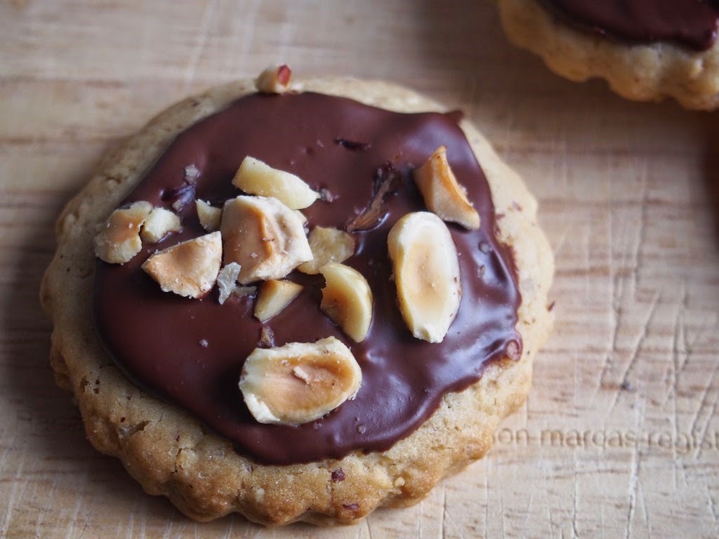 Amb l'ajuda d'una espàtula repartim una capa de xocolata per sobre de cada galeta i decorem amb avellanes trossejades.